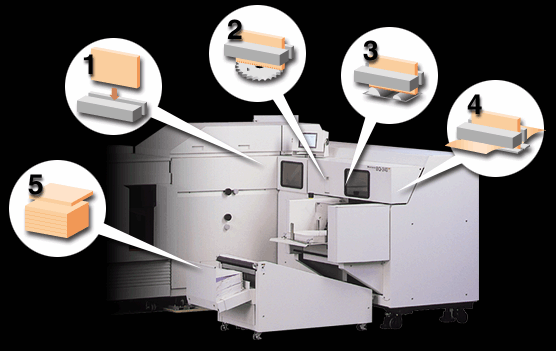 1. 進紙,裝前頭數位印刷產生一本一本的書由夾子咬住進入裝訂機具。