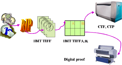 而在 RIP ONCE的流程裡有一種行之已久的檔案格式最被大家所接受,就是 1 bit tiff 檔。它是已被過網成與輸出設備分辨力有關的訊號。拿這些將來就是要在底片或版上輸出的檔案來做傳統打樣當然是沒有問題,幾可亂真。但要用來做數位打樣可沒那麼輕鬆,因為這些高分辨力的檔案如果沒有經過特殊處理是沒有辦法在低分辨力的噴墨打樣機輸出的。只不過這樣的流程能讓您確認與未來的印刷品有著最類似的效果,畢竟與 PS 檔比較起來算是最穩定的打樣流程了。