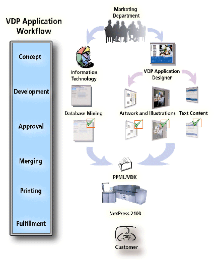 合併階段 (Merging):主要將以上設計所需的圖文或套表資料等依據標準的資料交換格式 (PPML/VDX PPML: Personalized Print Markup Language/ Variable Data eXchange )製作成數位母版 。