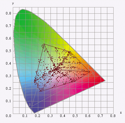 xyY色度座標圖,為一馬蹄形的色彩空間,非均勻的色