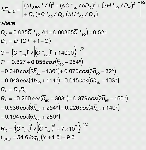 Luo 和 Rigg 收集了足夠的小色差色對資料,結合了可接受和可感知等兩種特性成為資料組。BFD 的色差公式就是依據這些資料發展出來,它與 CMC 色差公式的結構相類似,唯一的不同點是 BFD 當計算彩色圈畫在彩色軸 a*b* 時, BFD 並沒有全部指向如同 CMC(l:c)所假設的灰點,而是採用均勻明度的方式。
