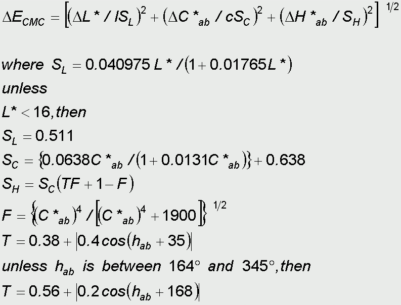 McDonald 採用了視覺判斷方式(用八個專業人士)的實驗來決定色配對是否可被接受,後來據此結果再演繹成 JPC79 公式,並被命名為 CMC(l:c) ( Colour Measurement Committee of the Society of Dyers and Colourists)。主要是針對 lightness 和 chroma 做了權重的估算: