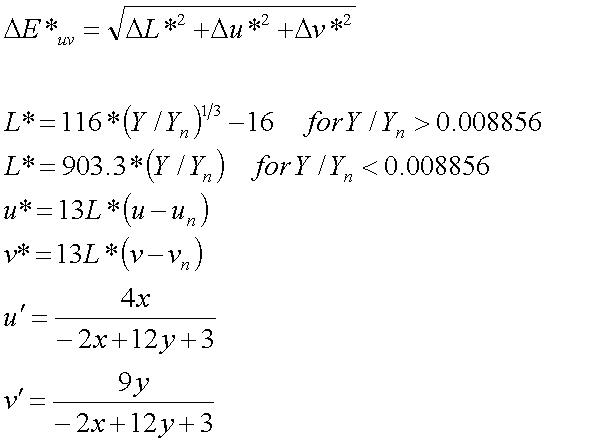 VX, VY, VZ可由上述均勻明度標尺的方式,經由公式轉換求得。如果是採用標準照明體 C ,則 XC=1.01998X, YC=Y, ZC=0.84672Z
