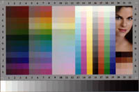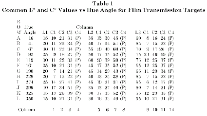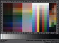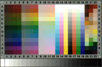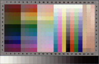 包含了 cyan, magenta, yellow, neutral, red, green and blue的顏色。較值得一提的是灰階的地方,亦即第 16 欄,從 A16之最小濃度值,至 L16之最大濃度值之間,是以等明度間距的方式來表示灰的階調。