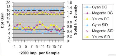 由於內控型是採即時的量測,不需假手他人就可調整四色供墨系統,且於很短的時間內完成,並維持高水準的穩定性。GATF宣稱可以維持滿版濃度值正負差異於0.06之間。而據羅徹斯特理工學院(RIT)的Bill Pope實證結果顯示,輪轉機約在1,500轉左右的時候就可將滿版濃度的差異變化控制在一個標準差之內。此時的對照組,外控型系統,卻只能控制在三個標準差之內。