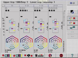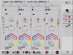 但也有些情形是色彩控制系統無法達到,此時控制台會將有問題的墨區顯示出來等著有經驗的技師來解決,看看是印刷機那裡的基本條件無法符合色彩系統的調整,如墨槽片、潤濕系統、橡皮布是否有髒點等情形,並儘快將這些不良的情況排除後就可以達到所要求的穩定品質。