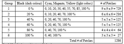 在做噴墨印表機調整時,最大的困難點除了描述檔 (profile) 的 reverse 模式的分色能力之外 (也就是從 XYZ 分色成 CMYK,講分色較轉換傳神),另一困難就是如何將噴墨印表機調整到理想的濃度值、灰色平衡、和平順的調子。如果調整得不順,你將會看到層次豐富、有漸層的稿子,在噴完墨之後反而產生嚴重的跳階現象。其主要因除了上述情形外,是否在印刷色空間的取樣上有不足的現象呢?也就是說 IT8.7/3 的 928 個色塊能否順利的完成整個色空間的取樣 (當然,我們所期待的是能以越少的色塊讓我們少量一點就越省時間) 。因此,提出了補充 IT8.7/3 更多取樣的方法,稱為 IT8.7/4。