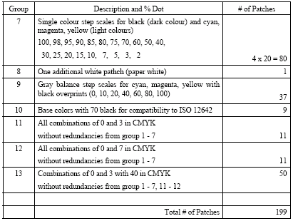 為了讓中間調、四分之一和四分之三的調子、灰色平衡有好的表現能力,增加了黑版的取樣值,這樣再和其它三色 CMY (與 IT8.7/3 相同) 搭配組合就有更多的取樣點了。雖然也是以四色印刷為主,但由於對前後四分之一的調子提出了更多的描述,所以也適用於彈性凸版和凹版。