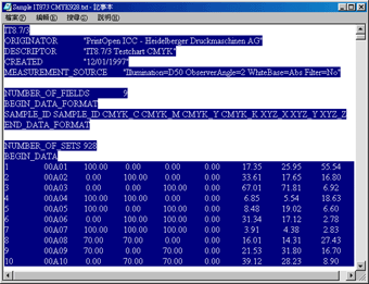 舉個例子說明,在印製 IT8.7/3 ,用儀器量取色塊的色度資料時,就可以和上次的色彩資料做比較。