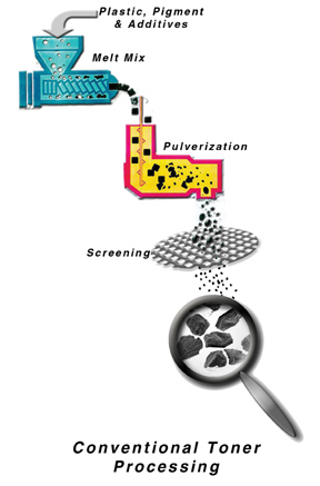 所謂傳統的色粉一般是指由塑膠、顏料、和其它添加物組成,然後磨成粉末狀的色粉,最後再經由過濾網篩選掉過大的色粉。