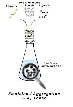 Xerox, Konica/Minolta 是採用膠狀聚合方式 "長" 成色粉。其色粉比傳統顆粒的表面還要滑順。Xerox EA toner 最小可達到 5 microns。