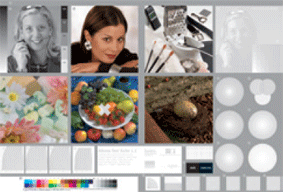 編號第 22, 24 號的中央交叉影像,其中央 X 區的色空間不再是一般的 CMYK,而是包含了 ICC 色彩描述檔 ( ECI-RGB) 的 RGB 影像。主要目的是用來測試 PDF/X-3 格式的複製能力。如果你的流程是屬於 PDF/X-3 相容的流程,那麼就不會很明顯的看到顏色的不同,如果不是則會很清楚的看到色彩的差異性存在。 附註:cmyk 影像是在影像處理軟體 photoshop 裡轉出來的,採用了 "convert to profile" 的功能,色彩描述檔為 ECI-RGB, ADOBE(ACE)色彩引擎,色彩對應的演繹模式為視覺上的 Perceptual 等參數。