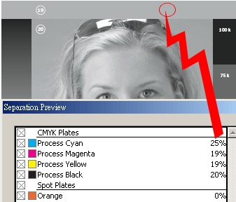 編號第 19, 整張影像的中性灰底是四色灰,其網點組合為百分比為 c25m19y19k20,可以方便視覺判斷和調整色彩時的依據。