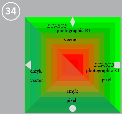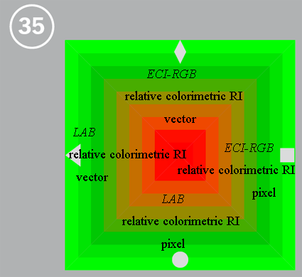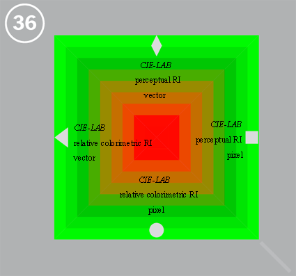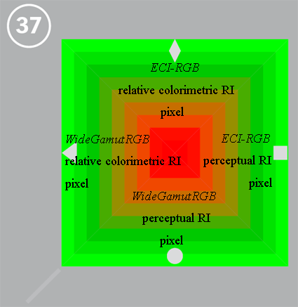 編號 34-38 為色彩管理色塊,主要是用來檢測對 PDF/X-3 格式內含不同色彩演繹意圖 (RI: Rendering Intents) 時的表現能力。每一方形都被區分成四個三角形,每一三角都有各自的色彩演繹意圖、向量 (vector) 型式或畫像 (pixel) 元素的資料型態,以及採用菱形、方形、圓形、三角形做各別標示。而在第 36, 37, 38 的斜角處有一灰線,如何處理得宜,這些灰線是可以顯而易見的。