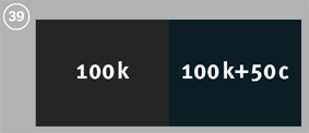 編號 39 為印前技術的小技巧,檢視單純的黑和加了 C50 的黑之視覺效果。因為在輪轉機印刷時常將大色塊的黑或黑字加上 C50 等以預防白點的瑕疵產生。