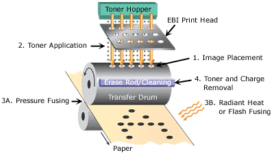 類似平版間接轉印的成像方式。其成像輥筒上的影像並不直接與紙張接觸,而是先透過轉印輥筒再印到紙張上。如此可以增長影像輥的使用時間。 |