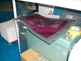事先採購己具有藥膜的網版,再用電腦噴墨的方式將顯影劑往絹布打點,就可以得到網版了。