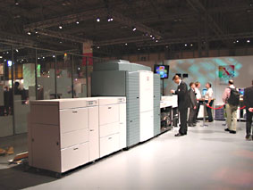 Xerox 這次展出的 iGen3 算是讓大家大開了眼界了。不但有實際的機器展示,還可以拿到器實際的印刷品。 iGen3 可以印彩色和黑白雙面,由於採用了像平版間接印刷的方式,因此在速度上均可達到每分鐘 100 張,一小時 6000 張的速度。另外,在會場還展示了 Nuvera ,連續式進紙的DocuPrint 525 and 1050,寬幅印刷的 6030 and 6050 等二款機型,以及 Xerox FreeFlow Scanner 665 。而 FreeFlow 則成功的整合了作業流程,讓生產資訊更自動化。