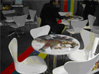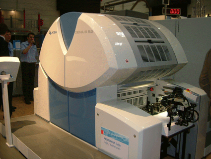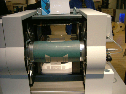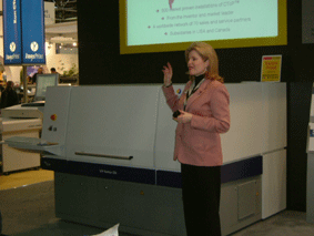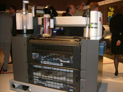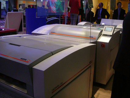 Agfa採用了 proscope 的放大鏡來介紹 sublima 網點。並且也展示了免沖版的 AZURA 版材,但還是要經過一道如同上阿拉伯膠的清潔版面的程序。此外,也展示了 APOGEE X2.0的工作流程、30mw 高能的紫光雷射二極體的 CTP 、可雙印面列印的 Grand SherpaMatic。