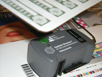 System Brunner 採用手動掃瞄量測的濃度計(Techkon製造),配合灰色平衡軟體來做自動色彩控制和評估。SYSTEM BRUNNER認為採用濃度計來量取傳統四色油墨和版上的網點面就夠精準了。 |