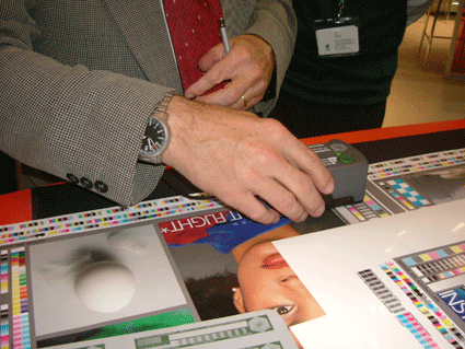 但對於現今的數位打樣出來的噴墨樣張上的品管工具,system brunner 認為由於噴墨的色相與傳統四色墨有差異,且是濃度計的濾色片無法偵測到的盲點,因此採用色度儀器才能客觀評估數位樣的色彩品質。 |