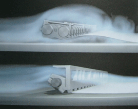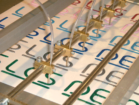 | 收紙咬爪的機械結構對風力的影響。上圖的風流較容易讓紙張產生起伏不平的情形,下圖經由結構性的改進,形成穩定的風流,並在紙張下方形成了約 8 mm 的空氣墊。 |