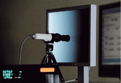 每個 EIZO 的螢幕在出廠前都會經由量測儀器測量、並加以調整。而在實際過程應該是黑色的環境,此圖為說明用。