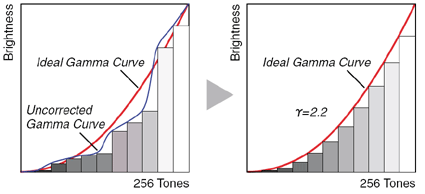 每一台 ColorEdge 的螢幕在出廠之前都會調整至 RGB 三個頻道的gamma 值到 2.2。並從螢幕上 10 位元對照表的 1021 個階調,挑選出 256 個階調以符合 2.2 的 gamma 值。而使用者也可以透過色彩管理軟體 ColorNavigator 的功能來調整客戶所需的 gamma 值,1.8~2.6。