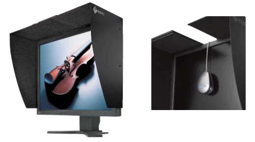 而在量測方面,除了可用自家廠牌的 CX1 來測量螢幕的色彩資料,也可以與 GretagMacbeth 的 Eye-One 設備相容。如果你也買了防止光害的遮光罩以利色彩的判讀和觀看,那麼在遮光罩的頂端有一可移動的蓋板,像天窗一樣,可以方便 CX1 或 Eye-One 等儀器量測。