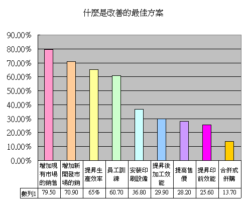 雖然這是一份美國印刷業的報告,不一定適用於本地,如台灣合版市場的尺寸是相當穩定的,合版生態使用網路傳送和交易的百分比也可說是全球居冠但。然而此報告對具有輪轉機的業者仍具有很高的參考價值。印刷業為了要積極的拓展業務和開發新的市場,除了業務能力之外,也必需要有適當的工具來增加客戶的服務,提高了附加價值才有可能開發出新的市場和業務。這點由印刷本業以外的收入有22%的受訪者認為公司收入的百分之20-39%是從業外得來,更有10%的受訪者則認為本身將近有40-59%是從業外得來。可以看出提供未來服務客戶的工具將會是增加業務競爭能力的要素了。