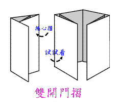 將原本是捲筒摺的方式,做成雙開門摺。如果以雙開門摺的對稱軸線來看左右兩邊,其實都是由捲筒摺所構成的。 |