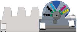 進紙部份:最大的創新是採用了無軸承的設計。以往紙張從飛達系統過了蝴蝶擋板至前擋規的整個傳動,均與印刷機的主軸承連動在一起。但 KBA 把此概念改由自動控制的方式變成無軸承的進紙方式,可以減少機械和齒輪的磨損。更由於採用了獨立驅動的馬達,紙台在上升的過程是連續安穩的,不會在紙台上升時有產生突然的震動。