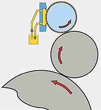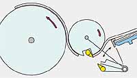 左:進紙的時間算準後,就由接紙的擺動手臂來抓住紙張交由進紙輥(feed drum)
