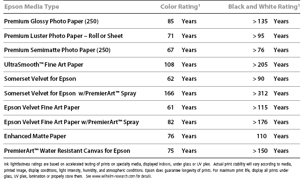 保存年限有關墨和紙的組合,以一般標準的照射環境下,其可保存年限為: