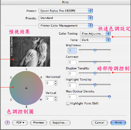 好的墨水和紙張。也要有良好的色彩控制面盤,此功能不但可以控制想要的色調,也可以單獨控制亮部和暗部的層次,並可以預視您調整的結果。