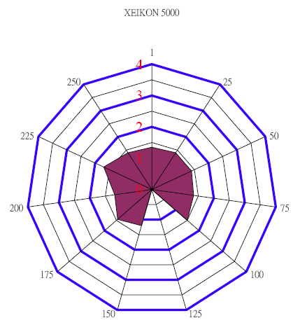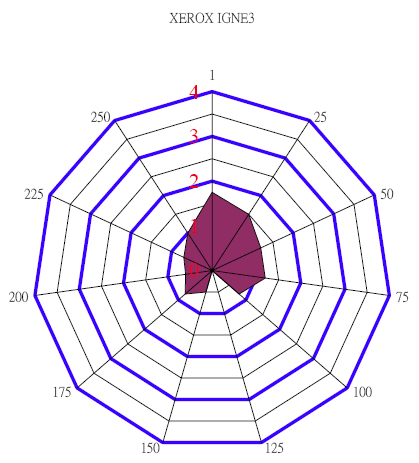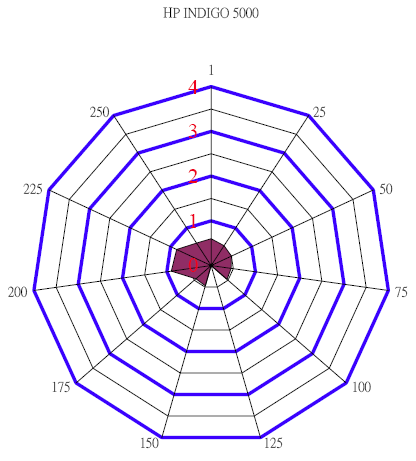 值得一提的是 Indigo 5000 的顏色表現能力,穩定性是領先群雄。平均值非常小△E=0.51。有了此結果之後,在測試時刻意將機器關閉十分鐘之後再開,令人驚呀的是有很高的穩定性,色差值只有 △E=0.88,真是技冠群英,宛如真正的平版印刷機。唯一令測試人員覺得需要大大改進的地方就是速度了,目前 A3 在一分鐘只能印 12.5 張。