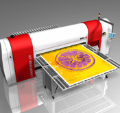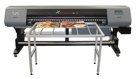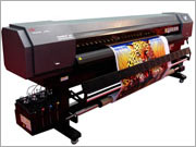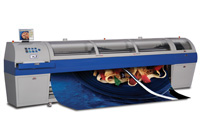 另一型為 98sx,可印的寬度稍寬些,可以到 250cm 寬,也是同樣使用溶劑型的四色墨水,每小時的速度也稍快一點點,可以達到 65平方米。在售價方面是便宜了點,約 65,000 歐元。