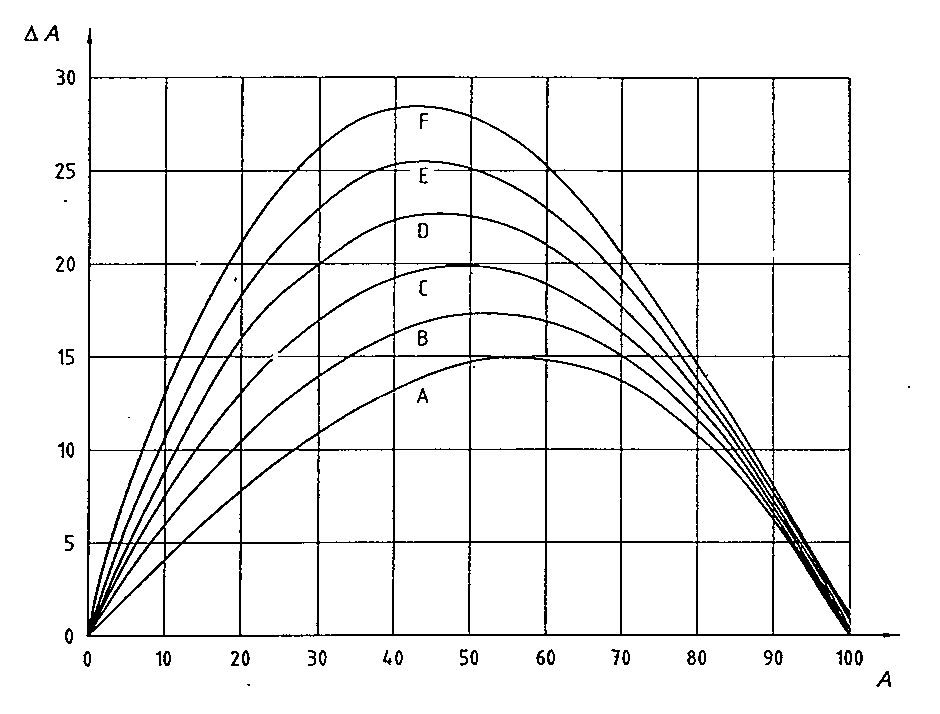 網點擴大曲線圖,曲線中的標示 A~F,是指上表50%網點擴大值的(A)~(F) |