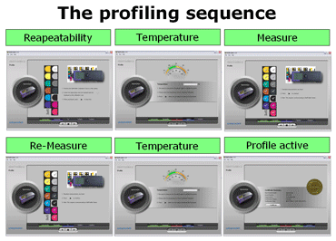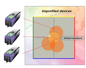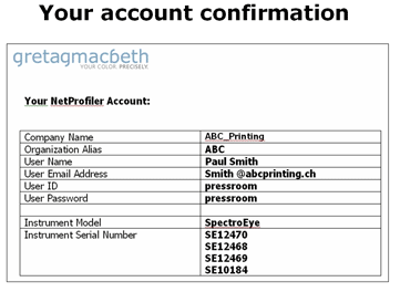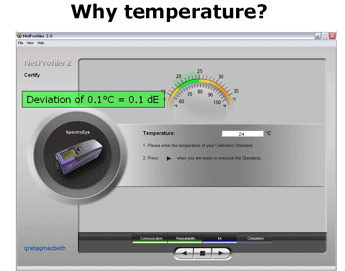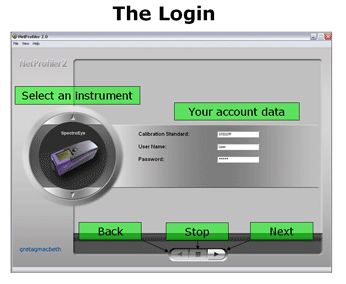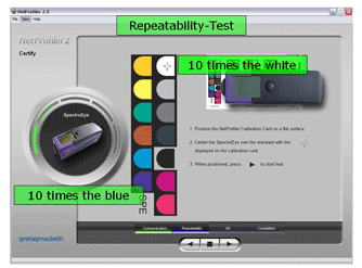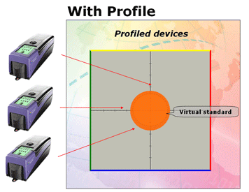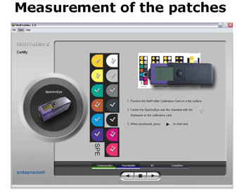 GretagMacbeth 提出了 NetProfiler 的作法,其目的就是要讓不同的儀器有相同的校準值,進而達到能相互用色彩語言溝通的實際用途。在這過程當中,使用者只要按照指示的畫面來操作,就可以從 GretagMacbeth 網站上得到修正函式 (或者稱為修正描述檔:Profile) ,並透過網路直接將此修正函式寫入儀器內,再經過驗證後就可以直接拿來量取色彩了。