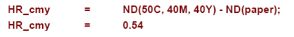 HR_cmy 可由量測三色灰的色塊濃度值減去紙白濃度而取得。此數值的定義如下: