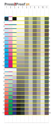 (Press2Proof)的測試因子,二條,放置時最好能二條相互成 180 度。此測試因子包含了一次色、二次色、單色黑、三色灰的階調。