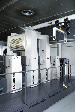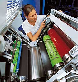 8. InlineFoiler, ManRoland。連線燙金設備,主要應用在包裝印刷時可以連同彩色一次生產完成,而且有了燙金的效果將會更吸引消費者的目光。對於標貼的廠商而言,可增加酒標、啤酒、飲料、化妝品、和日常標籤更有吸引力和明亮的感覺。對於雜誌等商業印刷而言,可增加封面的質感和翻閱率。