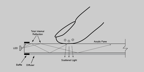 。將 LED 光線打入壓克力板,並利用光線碰到指頭產生的散射來抓取正確位置。因為 Forrest M. Mims