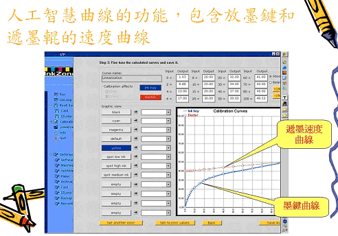 人工智慧曲線的功能,可以讓使用者依據紙張、油墨、客戶等要求,製作無限多組的曲線 |