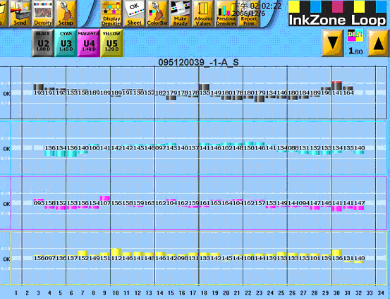 久昌印刷公司為了要達到前後印刷品質的一致性,深刻感覺到人眼的判斷是會疲勞和有差異的,因此採用了濃度掃瞄導表和自動回饋放墨調整的方式來維持印刷品質的一致性。而掃瞄後的結果馬上可以在螢幕上看到 KCMY 每一墨區油墨濃度的多少,而系統也會馬上建議那一顏色、那一墨鍵該做調整,調整的量是多少。久昌印刷公司也特別強調,此套系統絕對是幫助印刷師父維持色彩品質和免去繁鎖墨控調整的好工具,讓印刷師父更有精力在照顧印刷品質和印刷機的保養功夫上。
