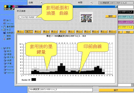黑色部份是印前來的標準放墨資料,而灰色部份是想要達到的放墨量,其方法就是套上想要的紙張和油墨曲 |
