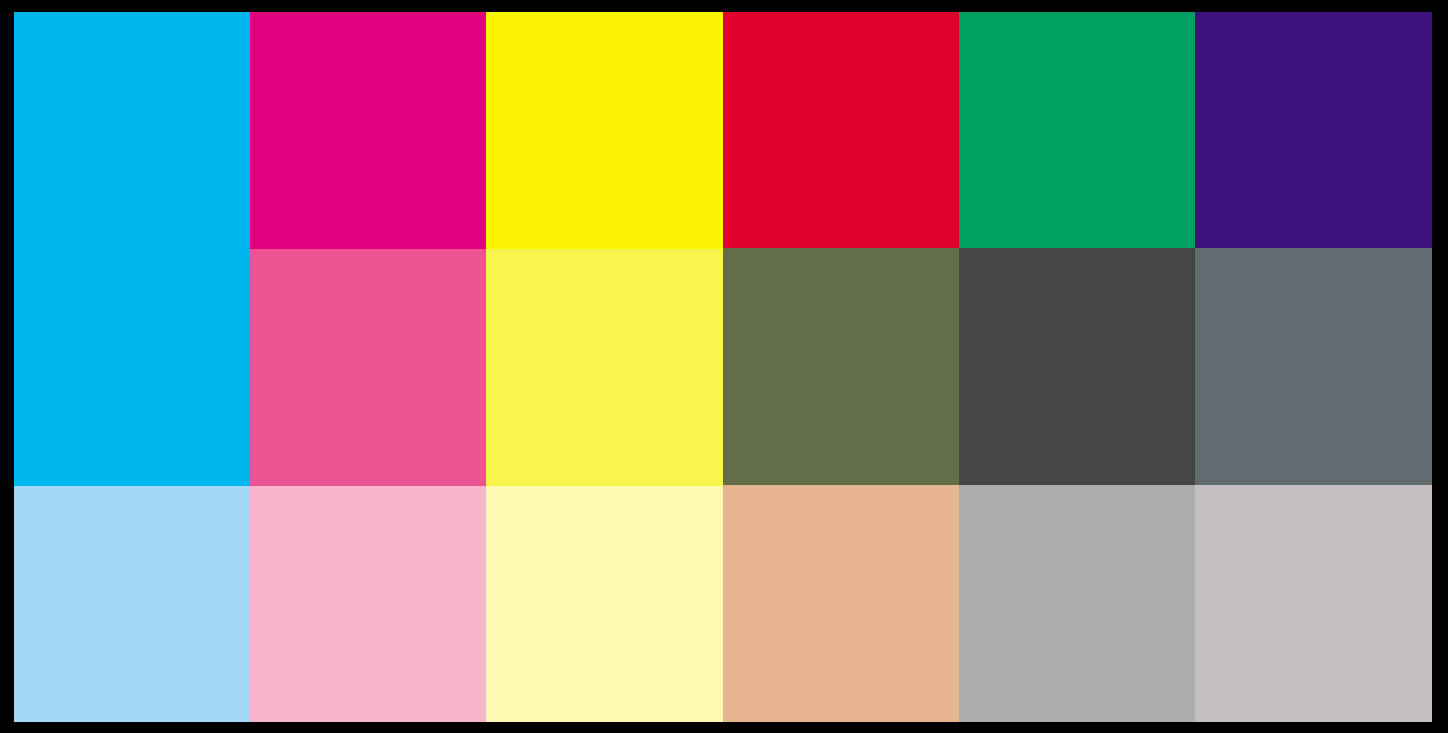 彩色導表在這裡只不過把平常用的長條式彩色控制導具放入此數位導表而已。所以在基本的構造上包含了四個色版(cmyk),每個色版有100, 80, 40%的網點,也包含了二次疊印色,紅(m+y),綠(c+y),藍(m+c),和三色灰及二個CIE定義的標準色。構造如下表: