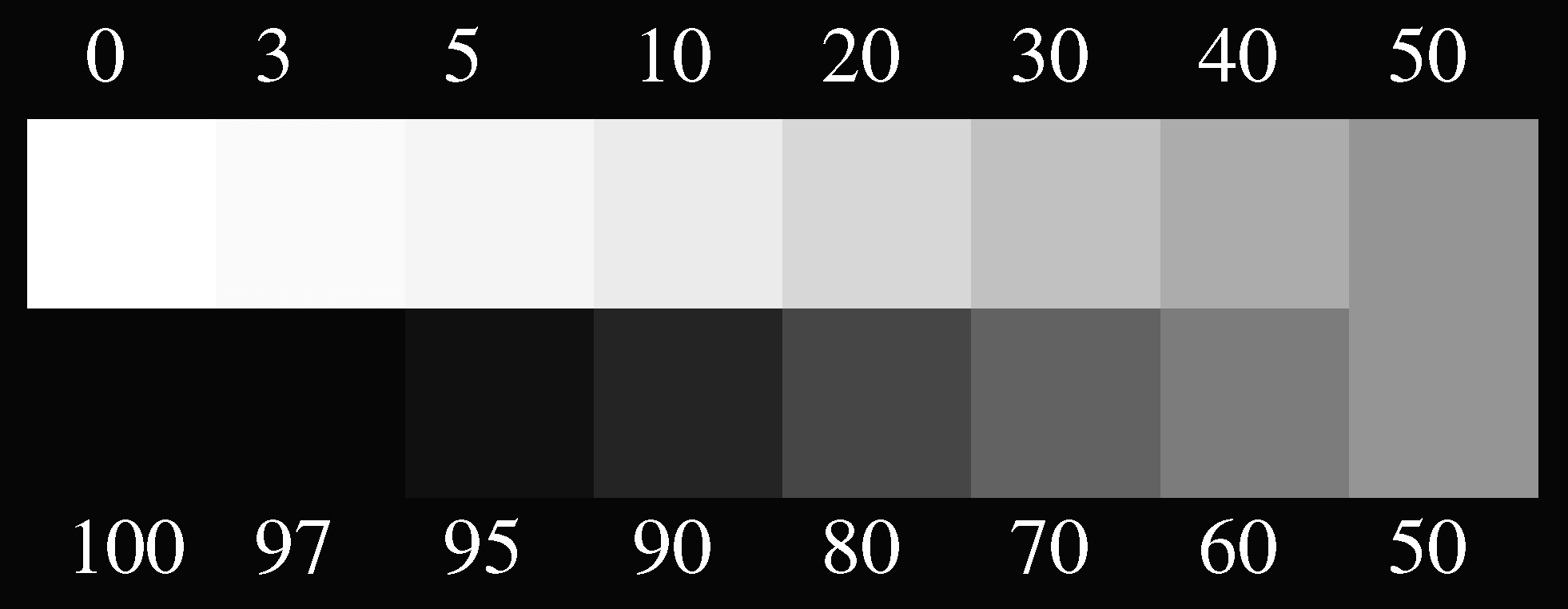 可以描述每個色版網點擴大情形,藉由100%可以量得各色版滿版濃度,並且可藉由80和40%測得暗部和亮部的印刷對比值(Print Contrast Value)是多少