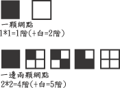 左右兩圖表示某一LPI的網點放大圖,你可以想像是(1/LPI)尺寸的放大,此時的"1"大都為一英吋。左邊是100%的方形網點,右邊的黑色區域佔整個格子的50%,所以為50%的網點。