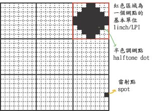 由於半色調網點有大小點的分別,如50%的網點是表示在一個單位方格內黑色訊號區所佔的比例是50%,那到底是什麼東西組成這些半色調網點呢?答案是你買的輸出設備,如噴墨印表機、底片輸出機或直接出版機等。以輸出機而言,雷射光點才是最基本的單位,我們稱為光點(Spot)。而一英吋有幾個光點就表示此輸出機的解析力是多少。在此以SPI (Spot Per Inch)是不是比DPI (Dot Per Inch)來個更傳神、更清楚。